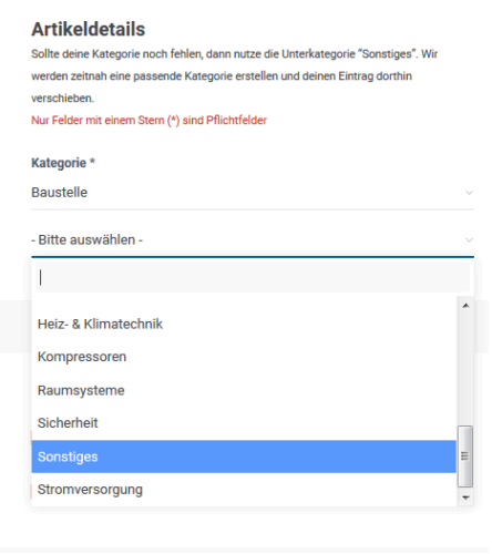 Erstelle deinen Mietartikel erstmal in der Unterkategorie “Sonstiges”, in regelmäßigen Abständen werden diese Mietartikel von unserer Redaktion überprüft und bei Bedarf eine eigene Kategorie erstellt. Deinen Eintrag werden wir dann automatisch dorthin verschieben.